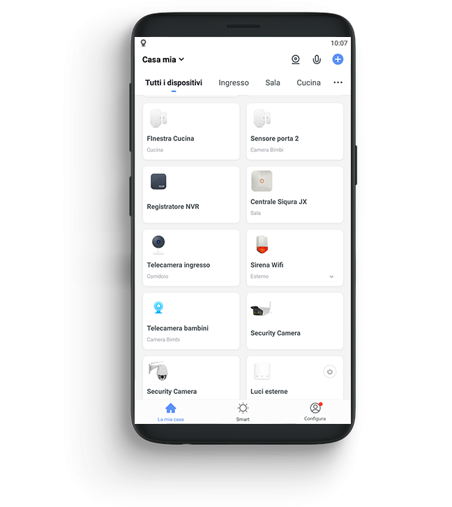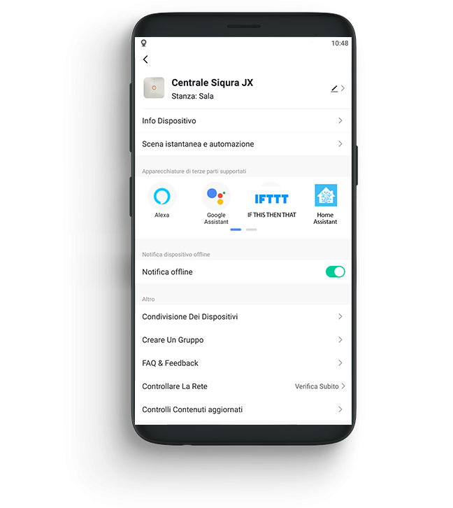 Notifiche push immediate stile whatsapp anche su più telefoni (Android e IoS) di avviso allarmi, assenza di wifi in casa, assenza di corrente elettrica nell'appartamento e di tutte le personalizzazioni impostabili.