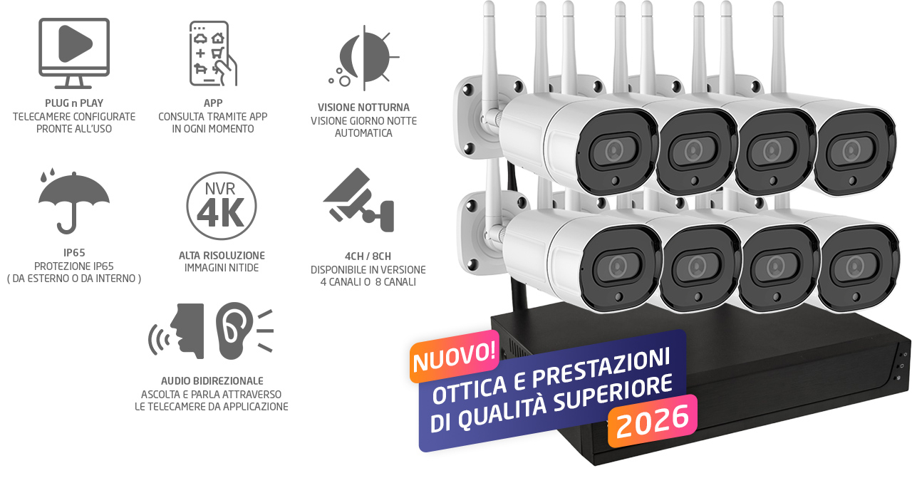 Soluzione integrata "telecamere IP + videoregistratore" di qualità superiore, molto più conveniente dell'acquisto dei singoli pezzi separatamente.