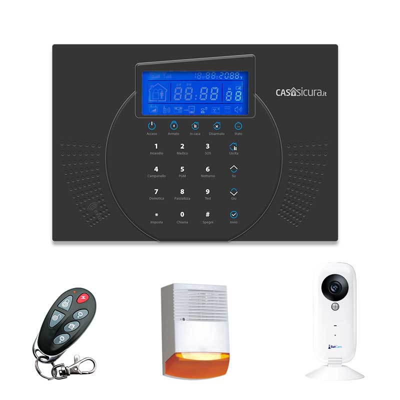 - Gestione dell’impianto tramite tastiera touch screen integrata, tastiera aggiuntiva remota (opzionale), telecomandi (da acquistare a parte o insieme ai kit in offerta) e remota da telefono fisso e/o cellulare.