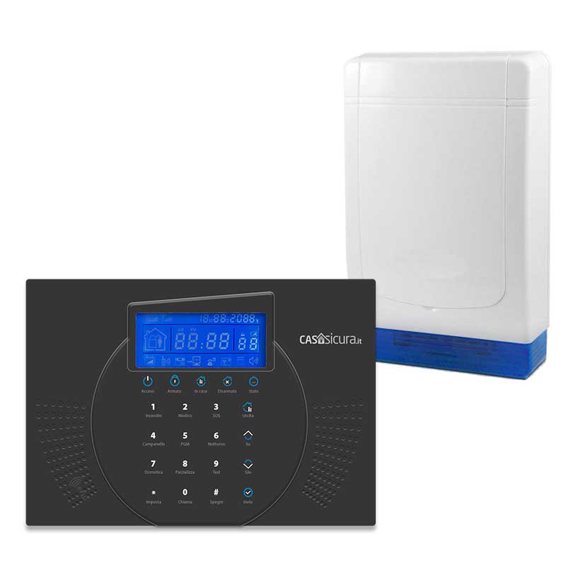 - Gestione dell’impianto tramite tastiera touch screen integrata, tastiera aggiuntiva remota (opzionale), telecomandi (da acquistare a parte o insieme ai kit in offerta) e remota da telefono fisso e/o cellulare.
