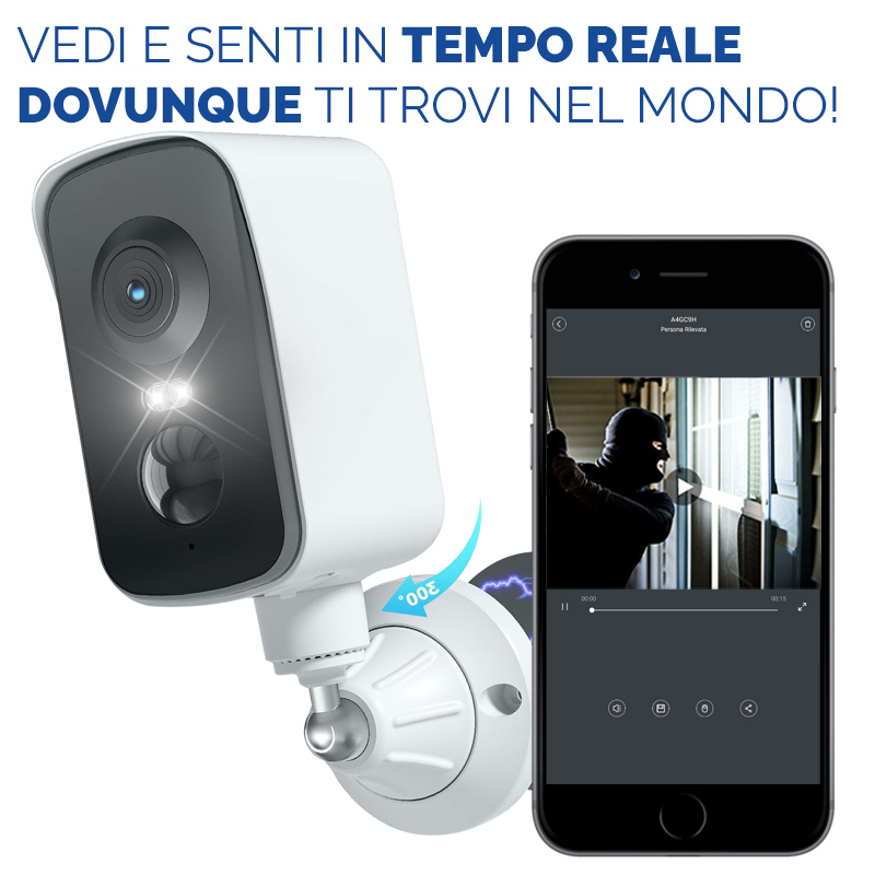 In qualsiasi momento, collegandoti alla telecamera dal tuo cellulare, potrai videosorvegliare (ed ascoltare) il luogo che desideri proteggere, ovunque tu sia, in tempo reale!