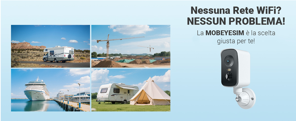 Di che SIM card ho bisogno? Mobeye trasmette audio e video di alta qualità. I dati vengono inviati tramite collegamento wifi, se presente, o tramite la SIM card inserita all'interno. Per l'utilizzo senza wifi, si può utilizzare un qualsiasi SIM (prepagata o ricaricabile con traffico internet, abbonamento o dati). Il consumo è di circa 2Mbyte al minuto, quindi una SIM con un traffico di 1Gb al mese sarà più che sufficiente, se -ad esempio- si consulta il Mobeye per circa 15 minuti totali al giorno. Il prodotto genera traffico solo quando lo si consulta da remoto, quindi se la telecamera è accesa ma non viene consultata, questa non genera traffico apprezzabile. Le prestazioni della telecamera dipendono dalla qualità della connessione alla rete cellulare 4G. La velocità di trasmissione dei dati, la stabilità del collegamento e la qualità complessiva del servizio possono variare in base a diversi fattori, tra cui: La potenza del segnale disponibile nell’area di utilizzo (numero di “tacche”), la copertura della rete da parte dell’operatore mobile scelto, la congestione della rete dati, le condizioni ambientali o strutturali che possono interferire con il segnale (ad es. muri spessi, ambienti chiusi, zone rurali). Si consiglia di verificare la copertura 4G nella zona di installazione prima dell’uso e, se necessario, valutare l’utilizzo di antenne esterne compatibili o SIM di operatori alternativi per garantire un funzionamento ottimale.