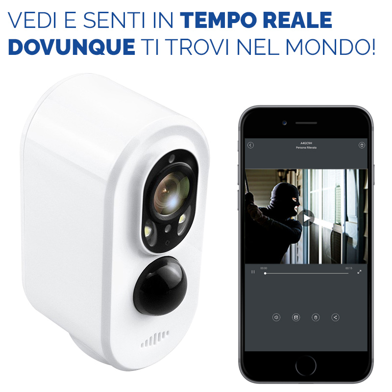 In qualsiasi momento, collegandoti alla telecamera dal tuo cellulare, potrai videosorvegliare (ed ascoltare) il luogo che desideri proteggere, ovunque tu sia, in tempo reale!