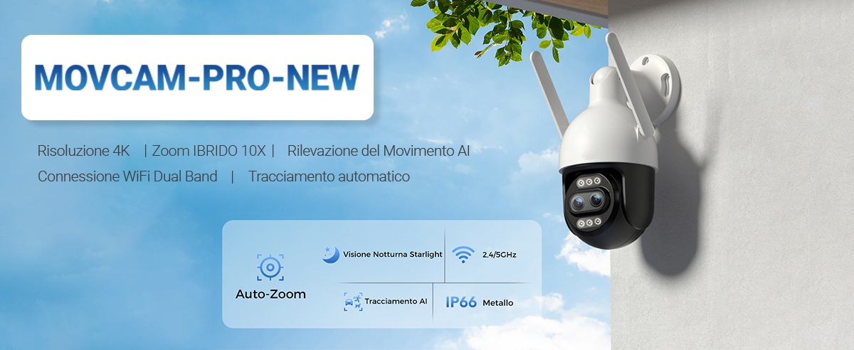 Desideri una telecamera che faccia tutto il lavoro per te? La MOVCAM-PRO-NEW con tracciamento automatico è la risposta. Dotata di rilevamento intelligente del movimento e risoluzione 4K 8MP, questa telecamera segue automaticamente persone e veicoli all'interno del suo campo visivo, inviando avvisi in tempo reale al tuo smartphone. Con il suo zoom ottico 6x (10x ibrido), puoi ottenere una visuale ravvicinata senza perdere un singolo dettaglio. Facile da configurare grazie al Wi-Fi dual-band, la MOVCAM-PRO-NEW ti offre una sicurezza avanzata che puoi monitorare e controllare ovunque ti trovi.