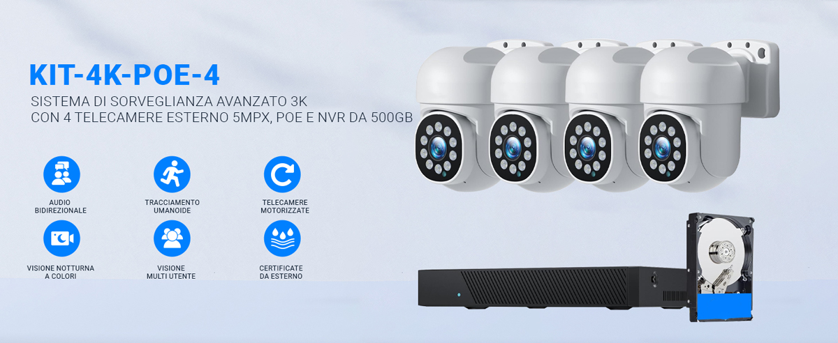 KIT-4K-POE-4 – La tua soluzione completa per la sicurezza 4K 8mpx(*) con audio bidirezionale - Auto-Tracking