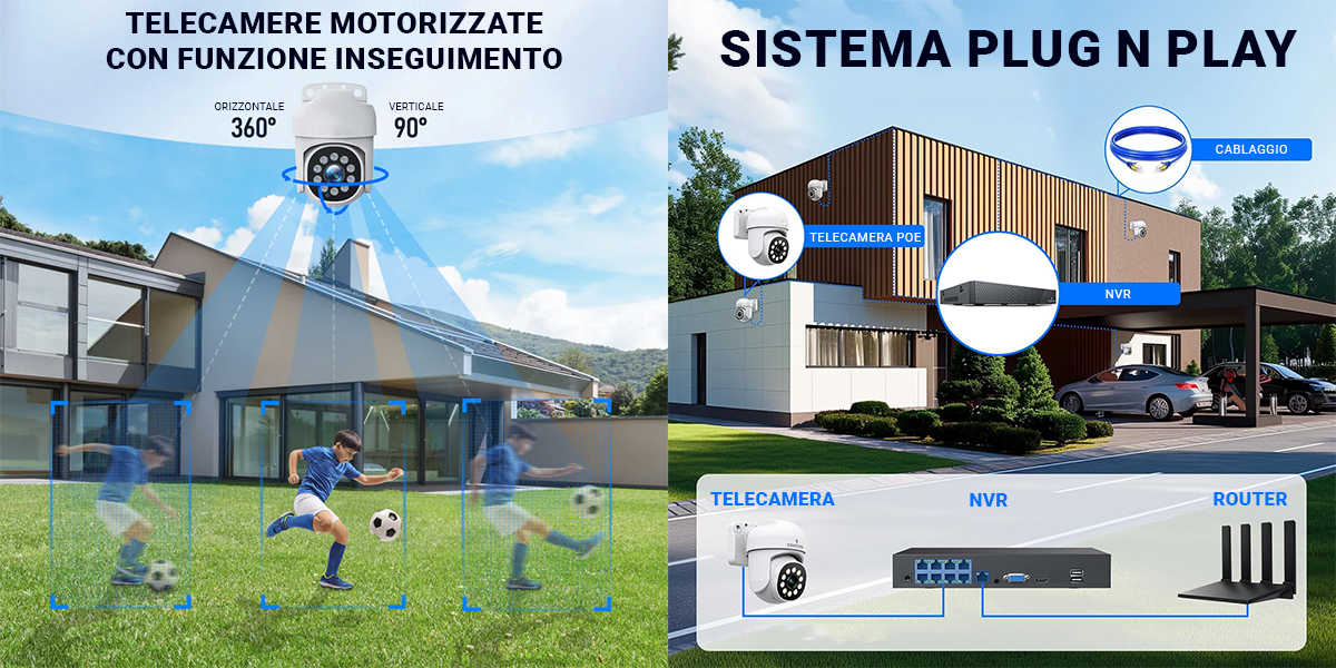 Grazie alla copertura panoramica a 355° e all'inclinazione di 90°, puoi monitorare vaste aree intorno alla tua casa, come giardini, cortili o vialetti, senza preoccuparti di angoli ciechi. Le telecamere possono ruotare per coprire l'intero perimetro, rendendo difficile per qualsiasi movimento passare inosservato.