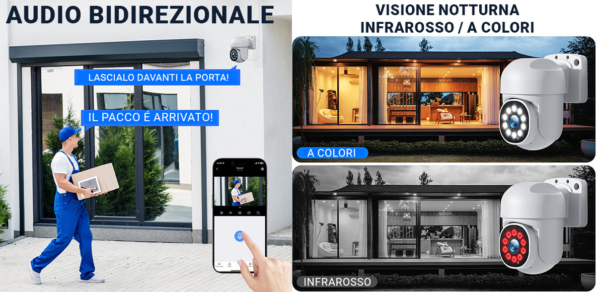 Se hai un ingresso protetto da telecamere, puoi utilizzare l’audio bidirezionale per comunicare con visitatori o corrieri senza aprire la porta. È perfetto per confermare consegne o fornire istruzioni a distanza, anche quando non sei in casa.